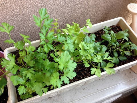 こんな感じで、ベランダ(エアコンの室外機の上)にプランターを置きイタリアンパセリとスイートバジルを植えてみました。