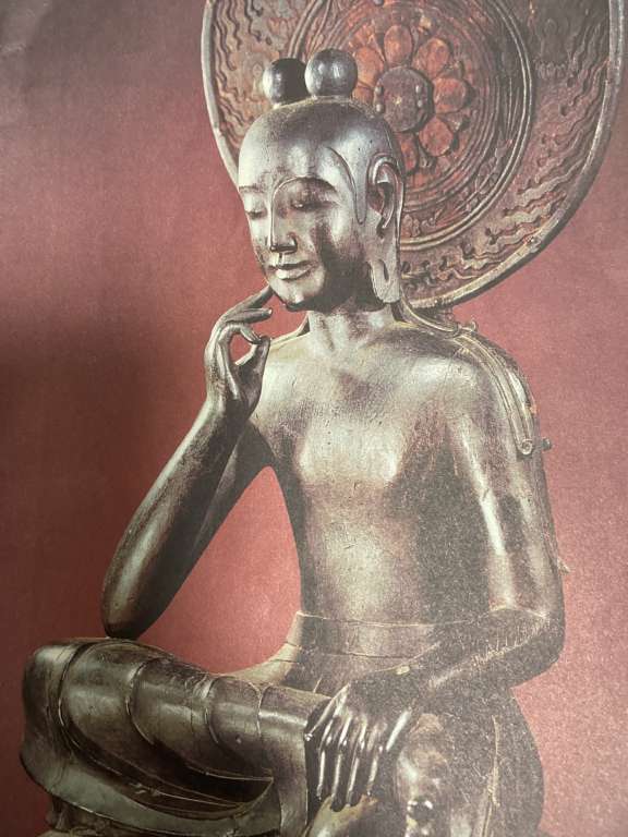 菩薩半跏思惟像 (国宝 飛鳥時代のもの:写真は館内で無料配布されていた河北新報のものをスマホで撮影)