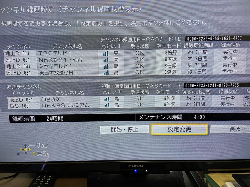 チャンネル録画の設定変更画面で録画するチャンネル、録画先を変更するを押します